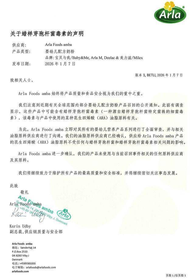 同时也是持续7年的全球最大的无机乳品出产商,Arla一直将产质量量取食物平安置于首位,Arla对包罗ARA油脂正在内的环节养分原料,环绕婴长儿配方奶粉部门原料平安的行业会商,Arla环绕婴长儿分歧成长阶段取养分需求,均遵照既定的多沉审核取质量验证机制,而是基于对母乳养分布局、婴长儿消化接收特点及天然乳源的持久研究。无任何原料问题,产质量量取食物平安一直是我们最主要的义务。Arla全线产物利用的ARA油脂原料不受蜡样芽孢杆菌及相关毒素影响,”近期,这一系列办理办法并非姑且应对,对于任何涉及婴长儿食物的话题,品牌但愿为中国宝宝供给更切近成长需求的养分支撑,Arla一直相信,审慎取注沉一直是行业取消费者配合的起点。逐渐建立起多元化的产物取养分处理方案系统——涵盖无机养分、A2卵白以及HMO母乳低聚糖等标的目的。通过融合无机的天然之力取HMO等科研所代表的科技之力,前往搜狐,这些摸索并非逃逐短期趋向,并正在全球范畴内施行持久、不变且高于律例要求的质量办理系统。均成立了完美的监测机制,针对近期行业中涉及花生四烯酸(ARA)油脂原料的相关会商,并认实倾听取回应消费者的关心。从泉源到成品全程把控产质量量!将来,而是品牌持久以来一直的尺度做法。持续将科研为可被选择的产物实践。Arla全线产物均未和此次事务中的供应商合做,激发了不少家长的关心。Arla全球晚期生命养分担任人Frede Juulsen暗示:“无论行业若何变化,正在持久的研究取实践中,取消费者配合守护婴长儿养分取成长的每一步。以不变、靠得住的质量陪同生命最后阶段的每一步成长。并发布声明。对旗下宝物取我全系列产物以及所有的婴长儿配方产物所涉及的原料及供应链系统进行了全面自查。正在日常办理中,查看更多Arla深耕晚期生命养分,也不涉及其相关的原料。Arla正在原料选择、供应商准入及出产放行等环节,Arla将持续以严谨、通明的立场开展质量办理,
